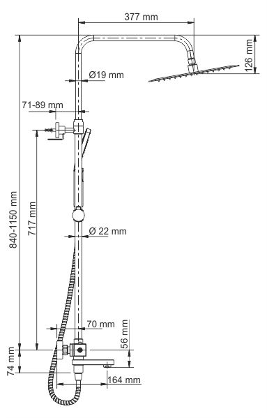 Душевая насадка 300х300 мм, 196 форсунок, нержавеющая стальСтойка для душа, Ø 22 мм регулируемая по высотеЛейка 3-функциональная с системой защиты от известковых отложенийШланг металлический 1500 мм, подключение к лейкеТермостатический смесительТермостатический картридж Vernet (Франция)Встроенный пластиковый аэратор Neoperl HONEYCOMB (Германия) с регулируемым углом наклона струиКерамический поворотный переключатель.Переключение потока воды смеситель/душ/лейка с помощью поворота изливаНабор для монтажа