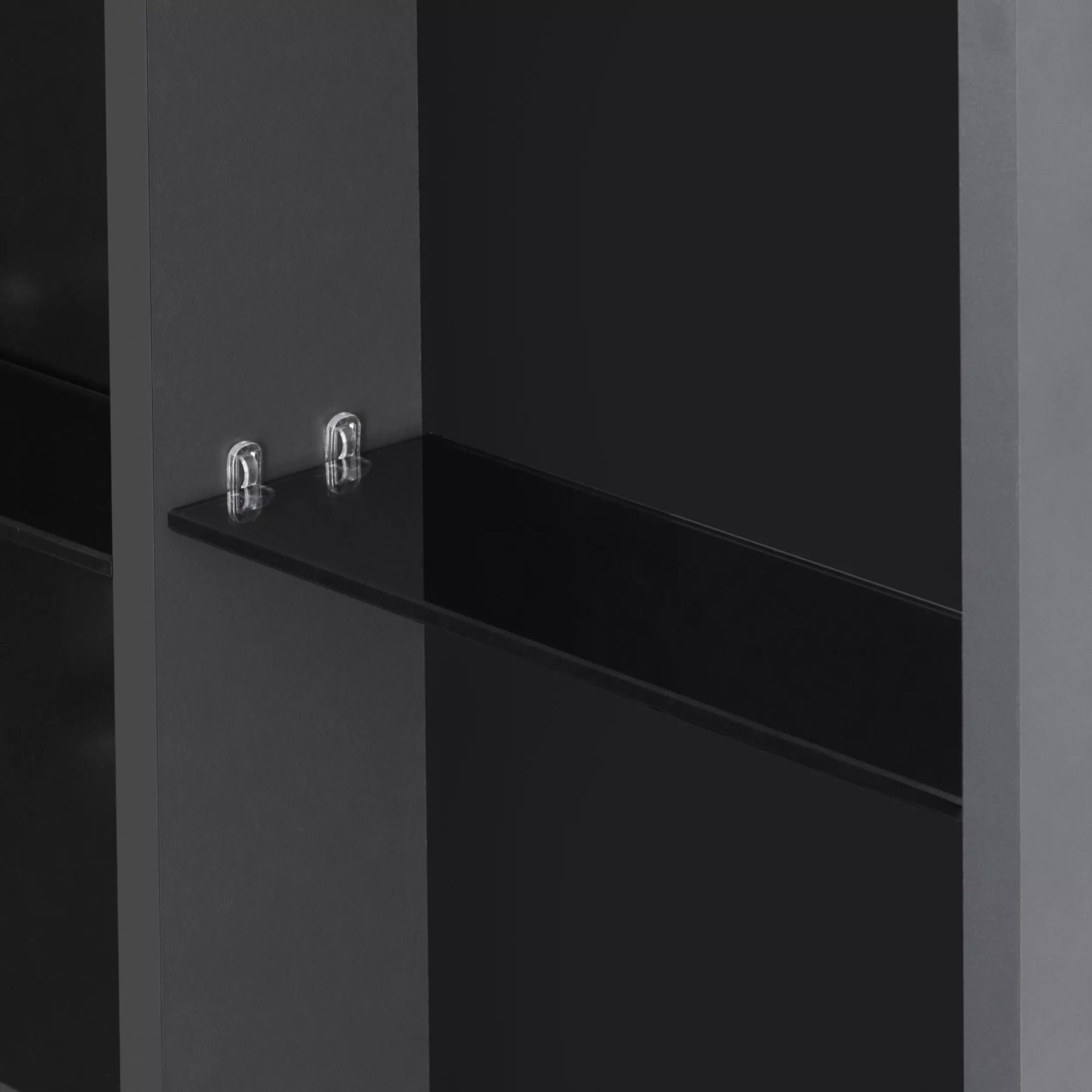 Сохо зеркало необычной овальной формы, скругленные углы добавляют индивидуальности изделию и безопасны в эксплуатации. Корпус и фасад выполнены также в цветовой гамме антрацит. Фасад оснащен петлями с доводчиком. За фасадом с зеркальным полотном расположена ассиметричная конструкция полочек, позволяющая хранить косметические средства различной высоты и объема. Перегородки из ЛВДСП антрацит сочетаются со стеклянными полочками цвета графит.
