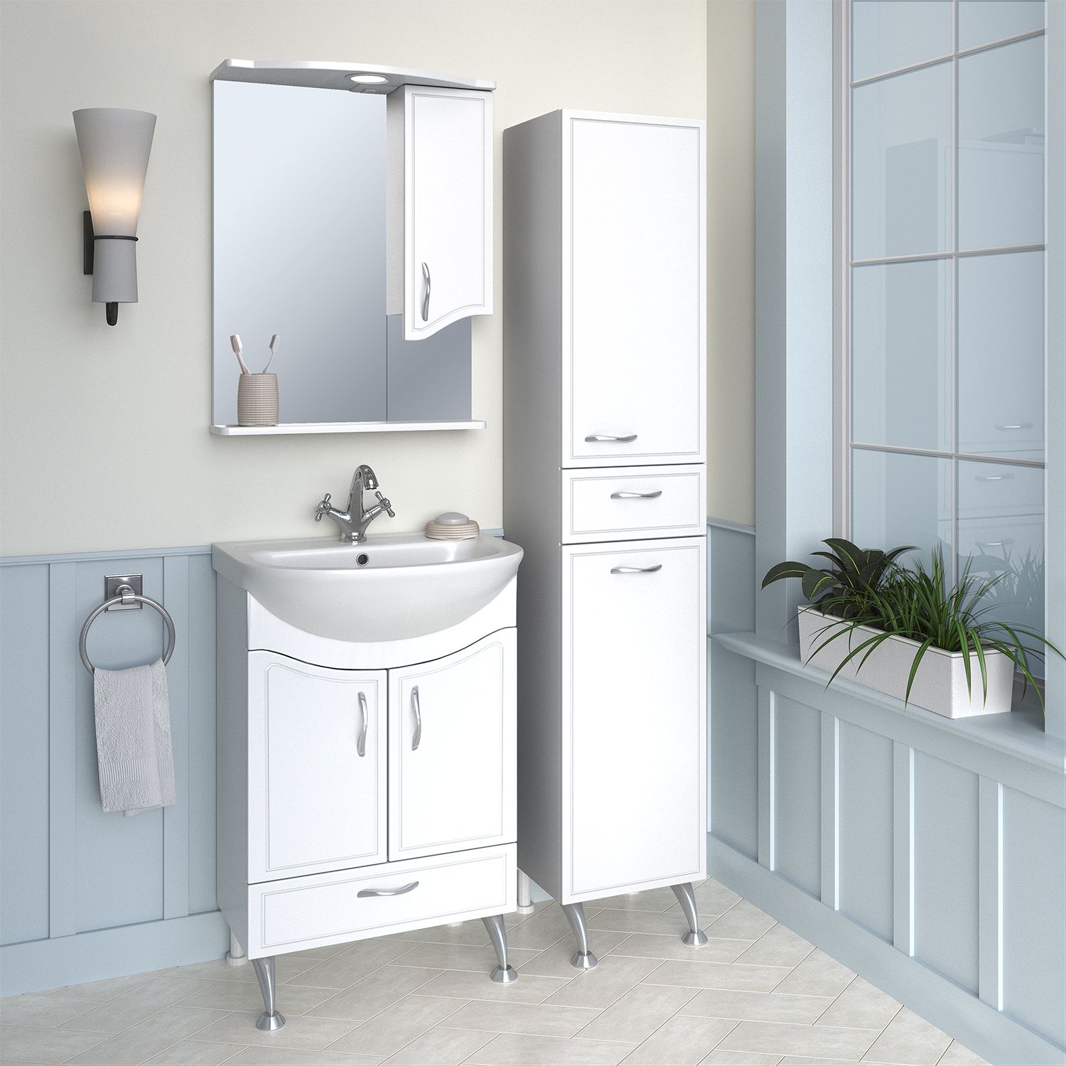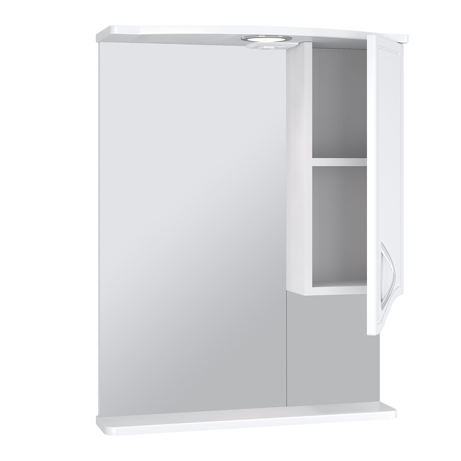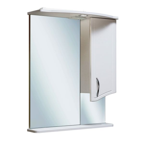 Зеркальный шкаф оборудован одним врезным светодиодным светильником 220В и розеткой с выключателем. . Справа - шкафчик с распашным фасадом и одной внутренней полкой. Под зеркалом - нижняя полка. Петли со встроенным доводчиком, ручка - 1шт. Выпускается только в правом исполнении.