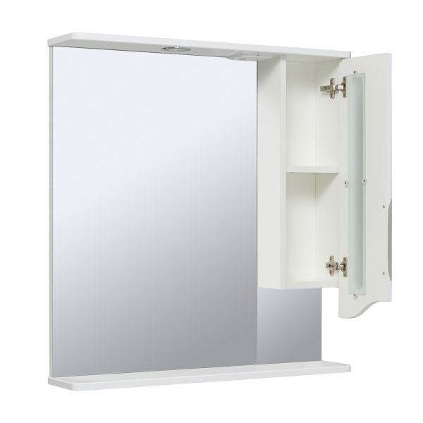 Зеркальный шкаф оборудован одним врезным светодиодным светильником 220В и розеткой с выключателем. Справа - шкафчик с распашным фасадом со стеклянной вставкой. Внутри - одна встроенная полочка. Петли со встроенным доводчиком, ручка врезная- 1шт. Выпускается только в правом исполнении.