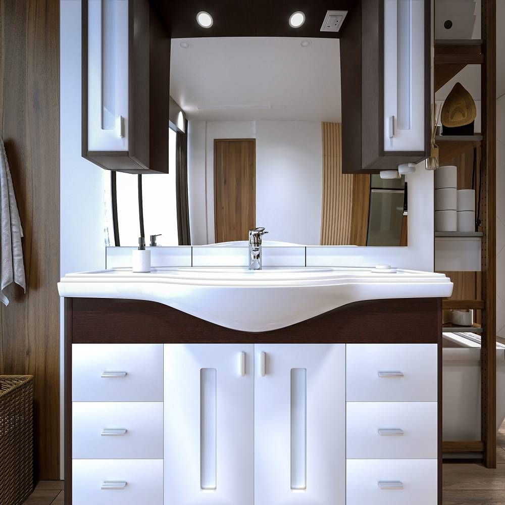 Внутреннее содержание шкафа умело организовано: разнообразные полки и отсеки позволяют удобно разместить все необходимые аксессуары – от косметики до бытовой химии. Зеркало, интегрированное в фасад, визуально расширяет пространство и облегчает утренние рутинные процедуры.