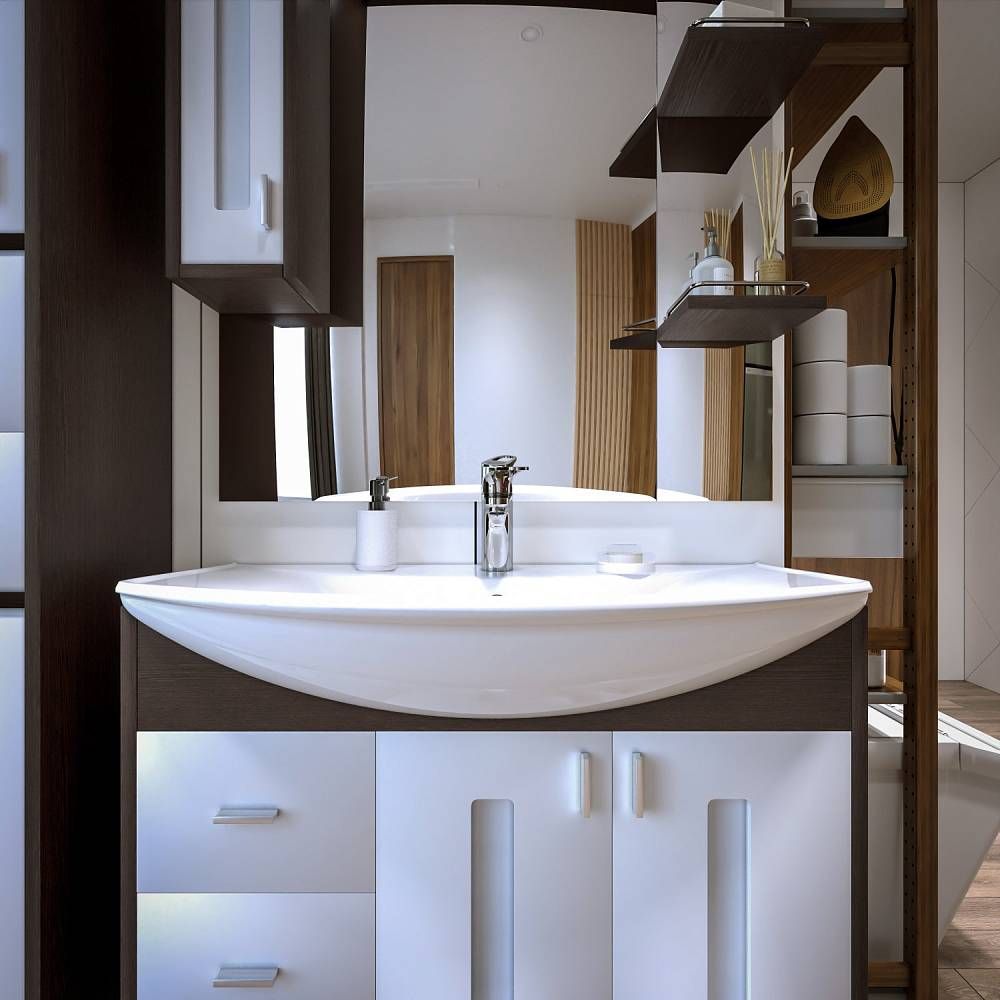 Внутреннее содержание шкафа умело организовано: разнообразные полки и отсеки позволяют удобно разместить все необходимые аксессуары – от косметики до бытовой химии. Зеркало, интегрированное в фасад, визуально расширяет пространство и облегчает утренние рутинные процедуры.