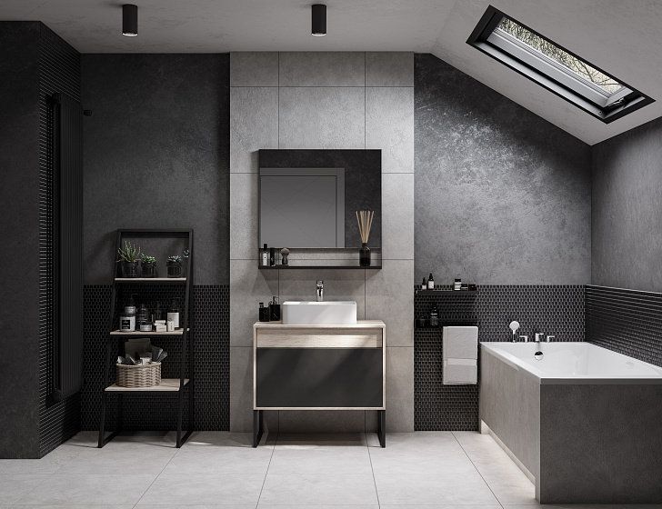 Чтобы оформить зону в едином стиле, в дополнение к тумбе-умывальнику, обратите внимание на прямоугольное зеркало 80 из коллекции AQUATON ЛОФТ Урбан на подложке из влагостойкой плиты, обрамленное по периметру металлическим профилем и полочкой с ограничителем, который препятствует падению предметов.