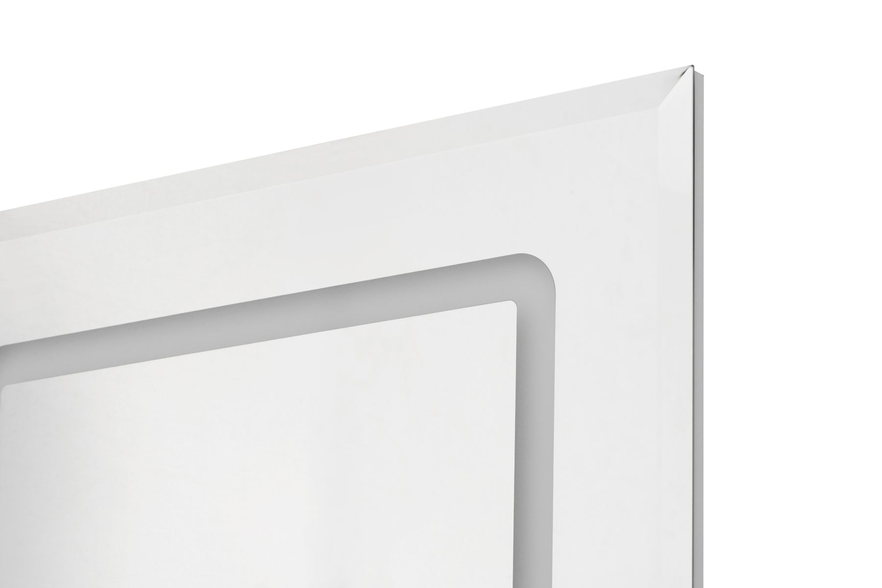 • В зеркале за гравировкой установлена подсветка, которая легко включается при помощи сенсорного выключателя