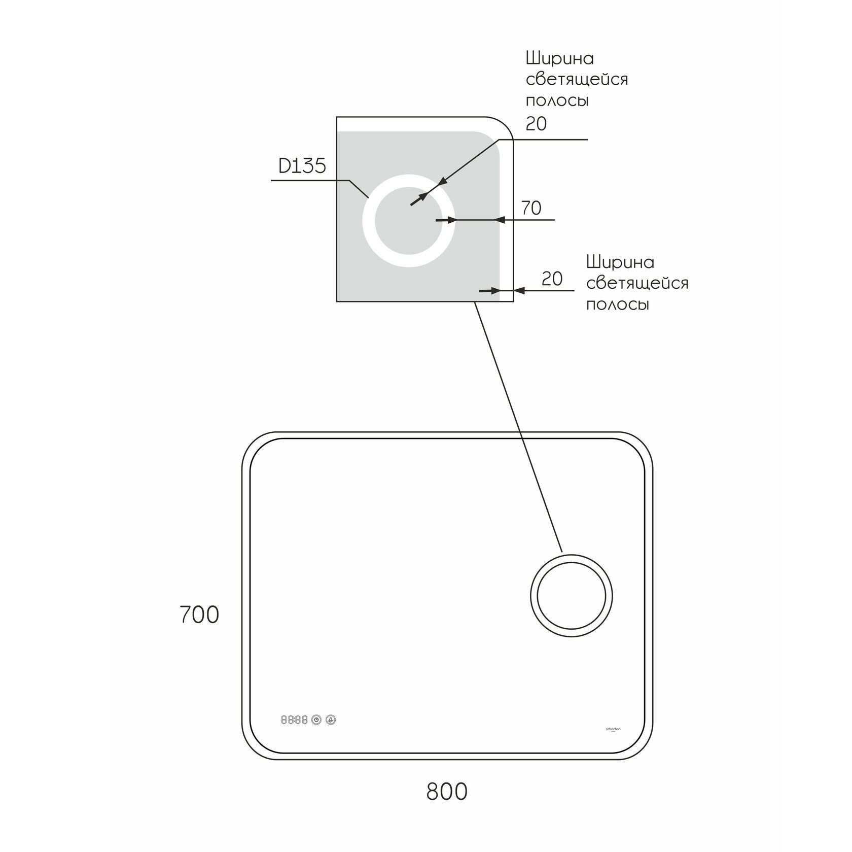 Предлагаем вашему вниманию зеркало с LED подсветкой, встроенным макияжным зеркалом и часами Reflexion Point 800х700