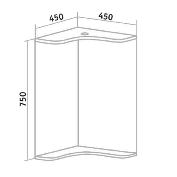 Угловое навесное зеркало с козырьком и нижней полкой. Оборудовано одним врезным светодиодным светильником 220В и розеткой с выключателем.