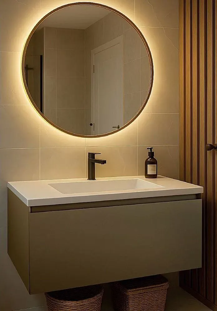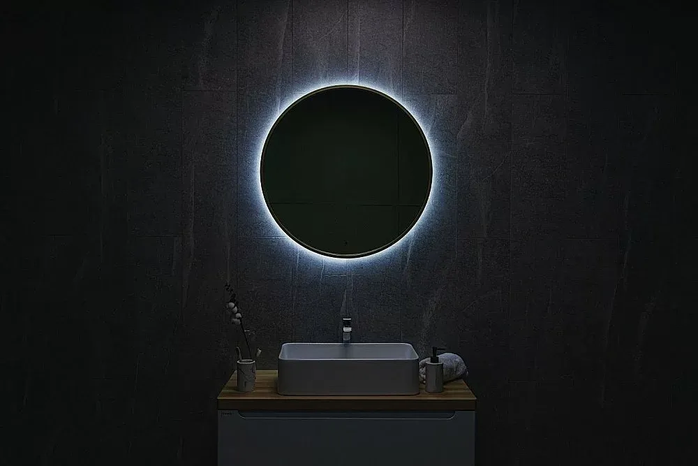 Ореольная подсветка подчеркивает форму зеркала и создает эффект парения.