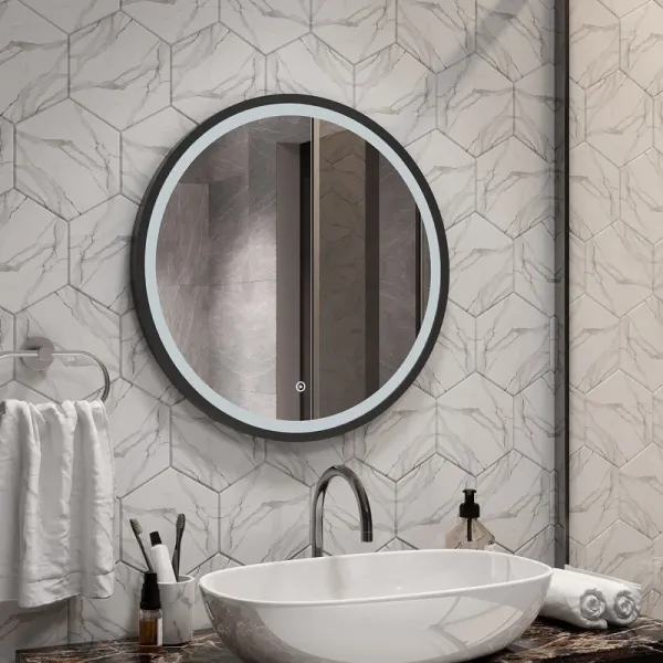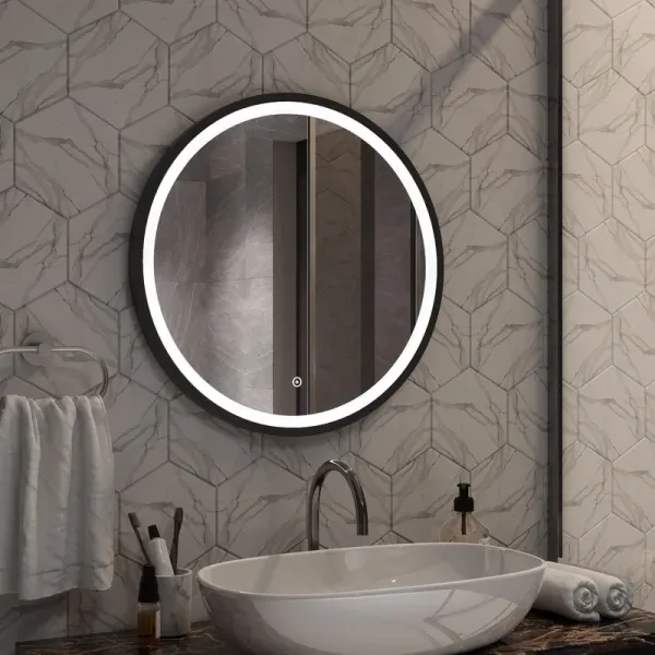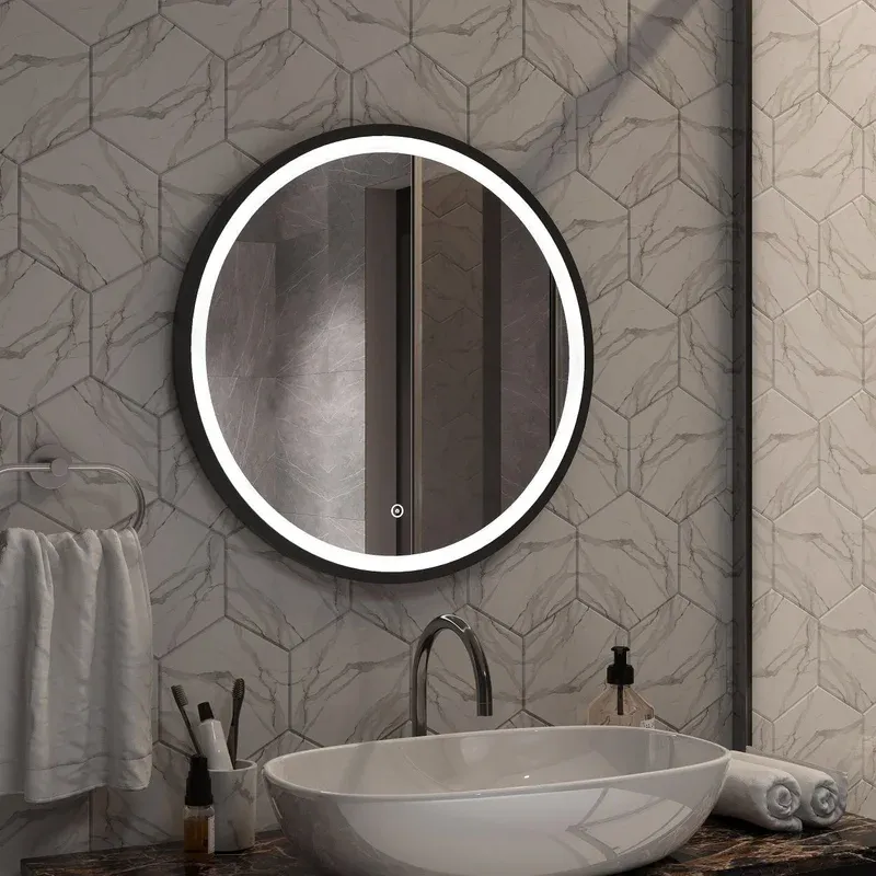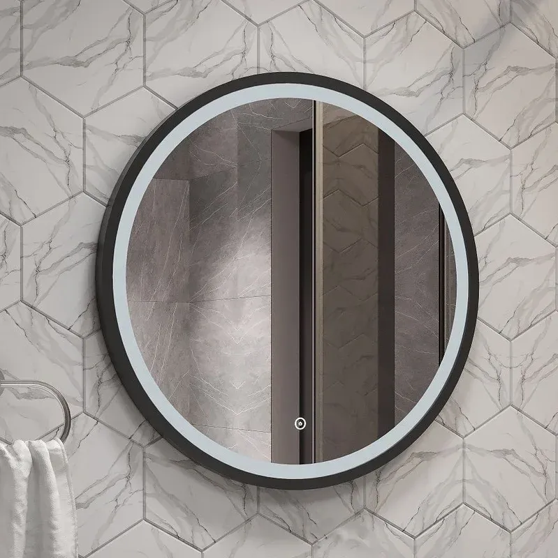 Круглое зеркало для ванной комнаты оснащенное светодиодной подсветкой с диммером и сенсорным выключателем .