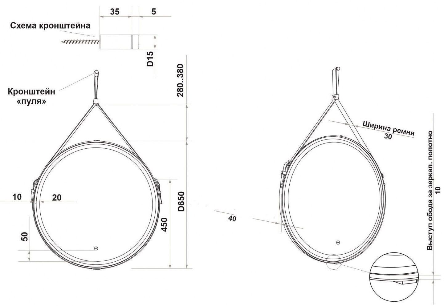 • Выступ обода за зеркальное полотно: 10 мм