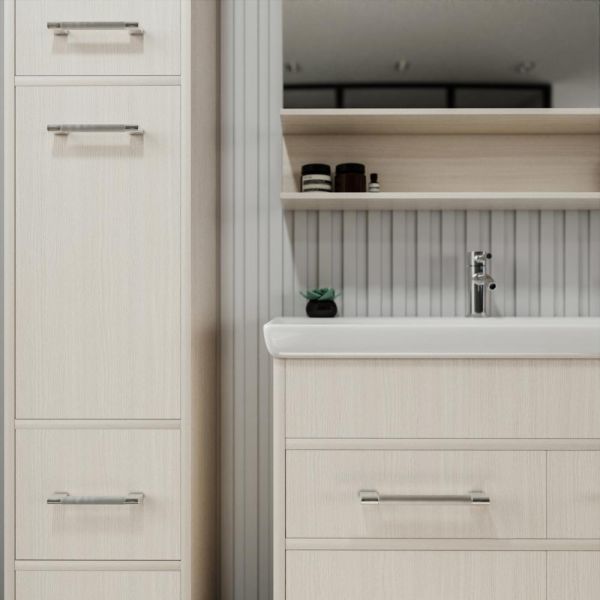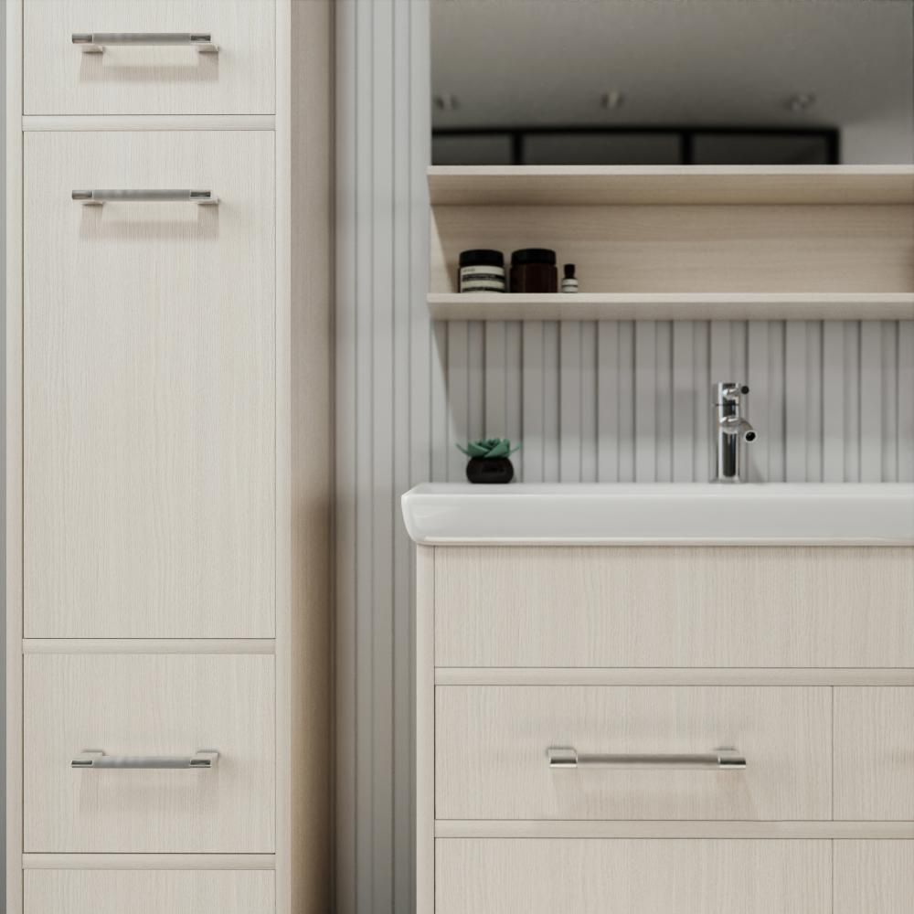 Его чистые линии и сдержанная форма создают гармоничный контраст с отделкой стен и сантехникой, добавляя комнате ощущение простоты и элегантности.