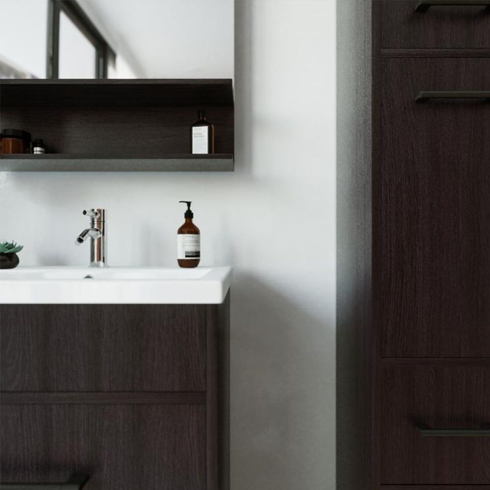 Его чистые линии и сдержанная форма создают гармоничный контраст с отделкой стен и сантехникой, добавляя комнате ощущение простоты и элегантности.