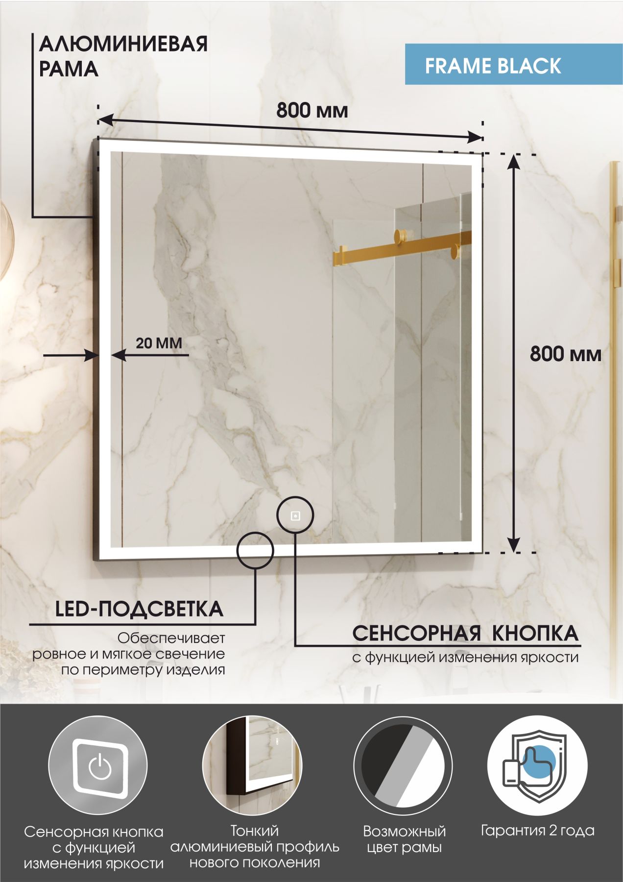 Зеркало "Frame Black LED" 800х800LED подсветка 6000Ксенсорный выключателькороб из алюминиевого профиля черного цвета