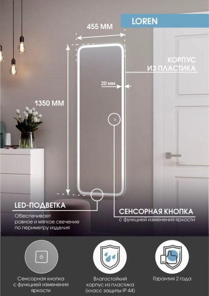 Зеркало "Loren Led" 455х1350LED подсветка 6000Ксенсорный выключатель с функцией димирования