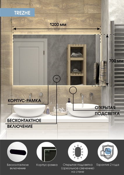 Зеркало "Trezhe Led" 1200х700 с бесконтактным сенсором, холодная подсветкаLED подсветка 6000Кбесконтактный сенсор с функцией димированияореольная подсветка