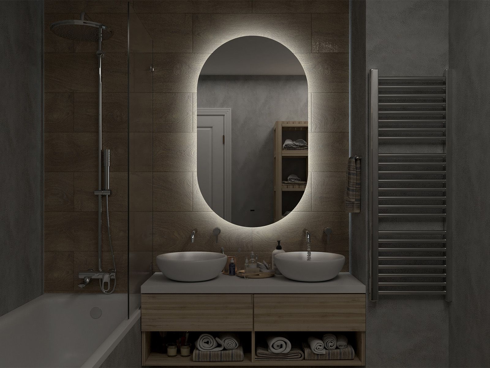Зеркало с подсветкой для ванной комнаты — это элемент интерьера, который сочетает в себе функции, эстетику и современный дизайн. Его изящная форма и тонкие линии легко вливаются в любое пространство, создавая атмосферу утонченности и уюта.Интегрированная светодиодная подсветка обрамляет зеркало, даря мягкий, рассеянный свет, который не только позволяет удобно наносить макияж, но и наполняет ванную комнату теплом и позитивной энергией.Классический дизайн позволяет использовать его в различных стилях – от минимализма до современного эклектичного оформления. Оно прекрасно вписывается в любую цветовую гамму, будь то нейтральные тона или более яркие акценты.