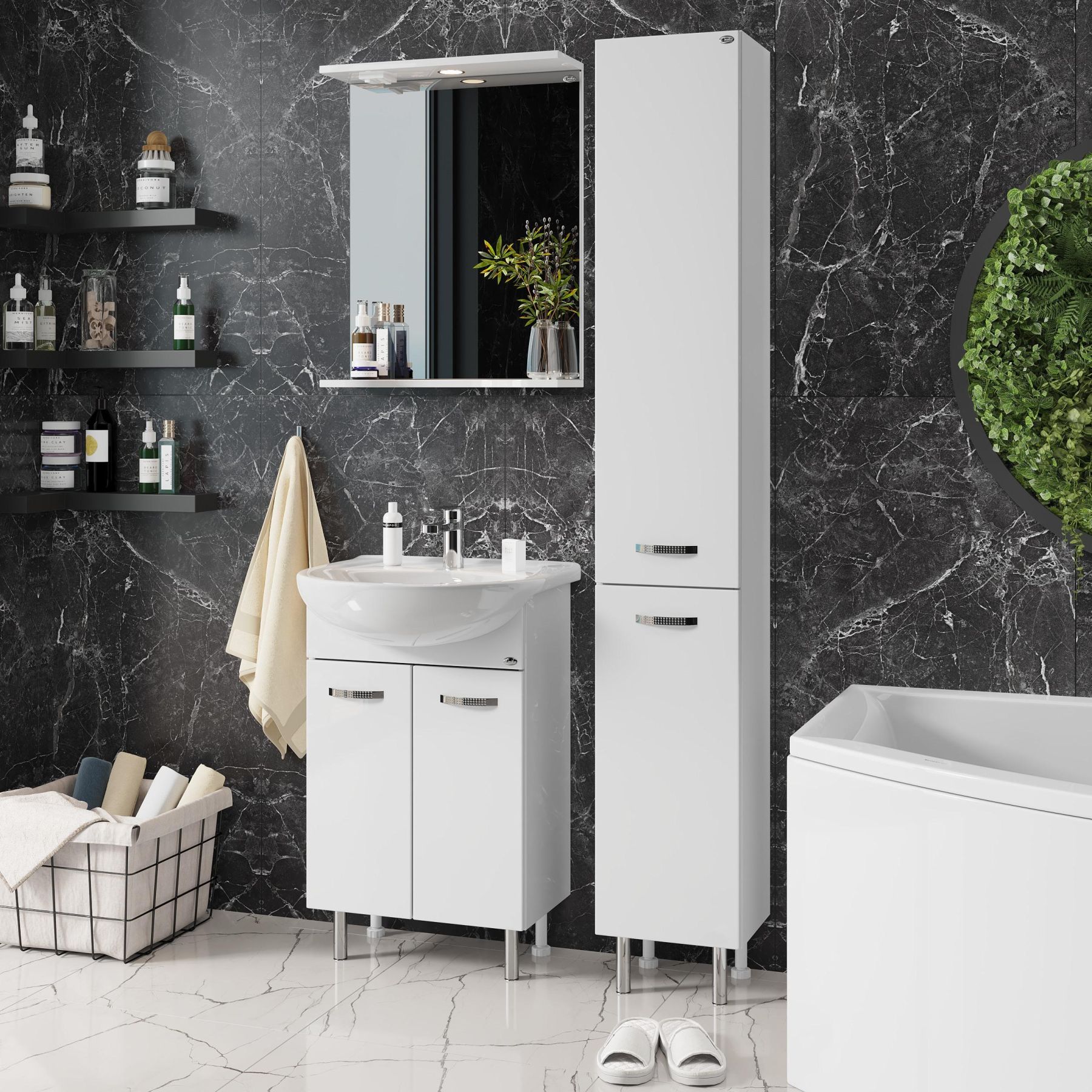 Основа для зеркала выполнена из ЛДСП, полка и козырек - из МДФ в пленке, устойчивых к механическим воздействиям, перепадам температур и высокой влажности.