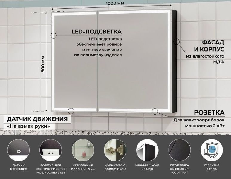 Зеркало-шкаф с подсветкой Art&Max Techno 100см чёрный матовый AM-Tec-1000-800-2D-F-Nero купить
