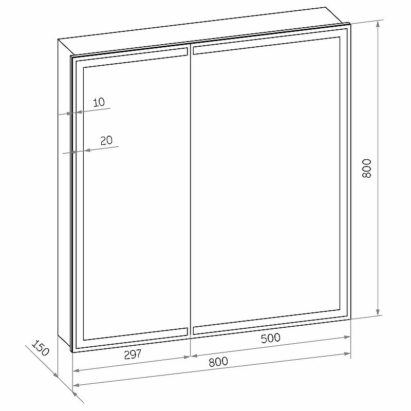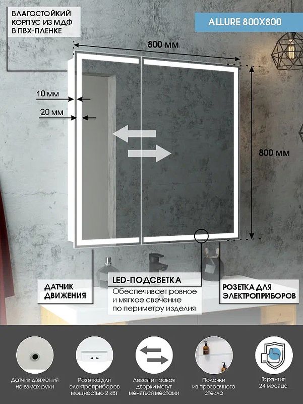 Зеркало-шкаф "Allure Led" 800х800 с датчиком движения, розеткойLED подсветка 6000К; датчик движения, Материал корпуса - влагостойкий ЛДСП + МДФ в пленке ПВХ, розетка, две створки