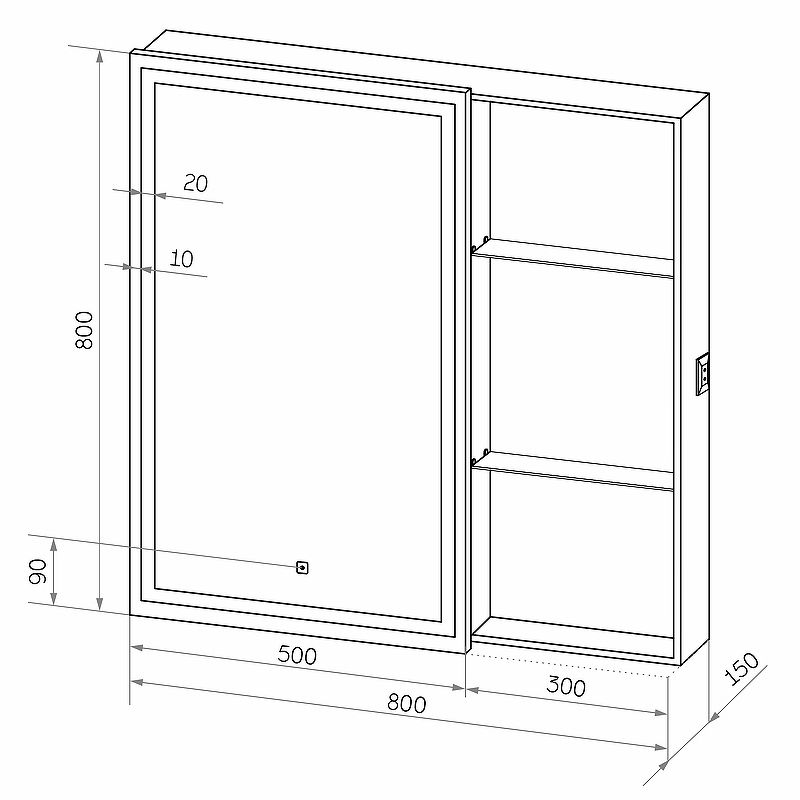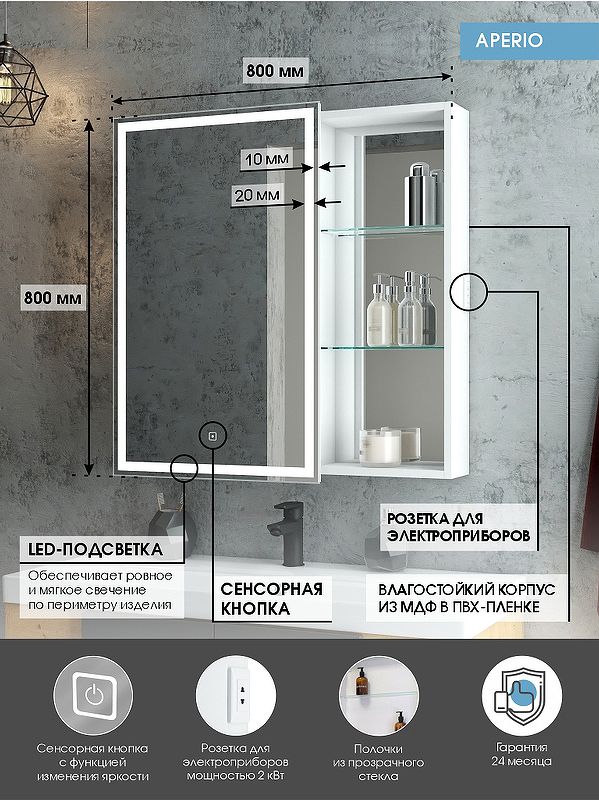 Зеркало-шкаф "Aperio LED" 800х800 левый с розеткойLED подсветка 6000К; сенсорный включатель с функцией димирования, Материал корпуса- МДФ, пленка ПВХ
